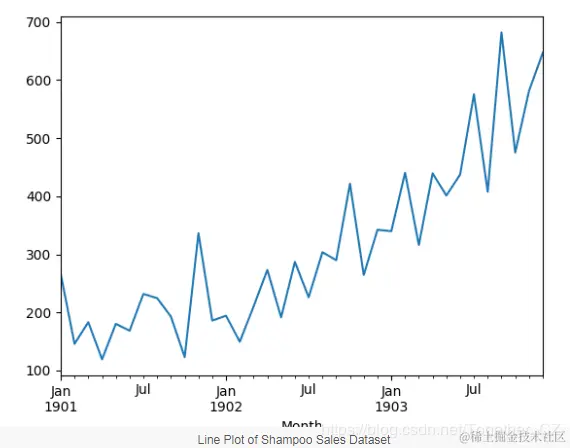 这个数据集描述了3年期间洗发水的月销售量。单位是销售计数,有36个观察值。原始数据集归功于Makridakis, Wheelwright和Hyndman(1998)。您可以在这里下载并了解有关数据集的更多信息。下面的示例加载并创建已加载数据集的图。