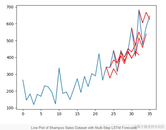 还创建了一个带有预测(红色)的系列线图(蓝色)。从图中可以看出,虽然模型的技巧比较好,但是一些预测并不十分好,还有很大的改进空间。