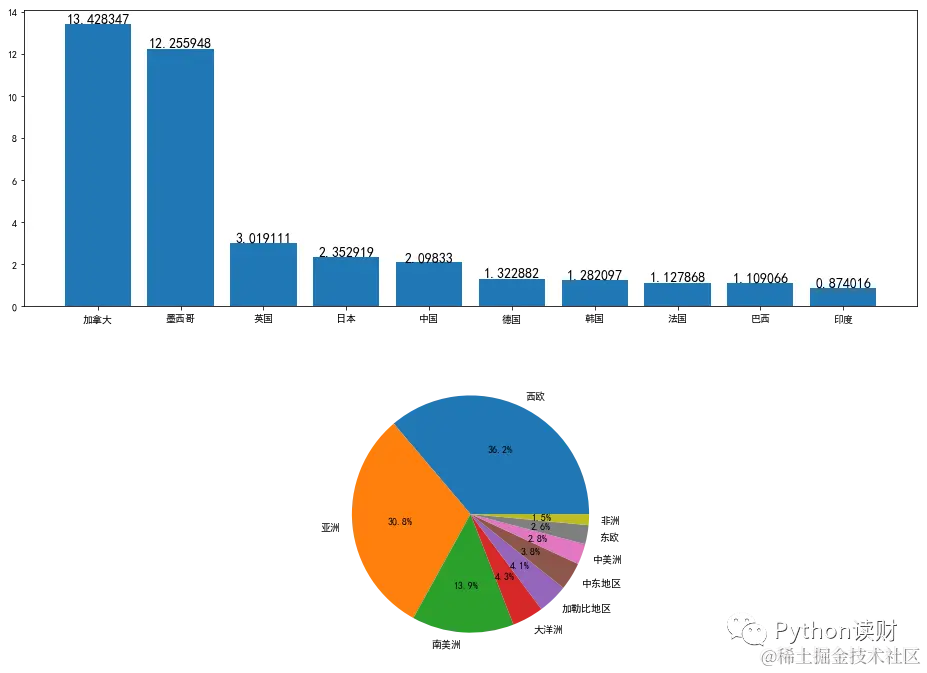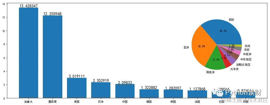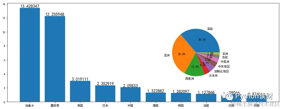 拿上面的数据例子来说,柱状图显示了2016年抵美人数排名前十的国家的具体人数,如果这时想结合各大地域抵美人数的占比数据进行分析,该如何绘图?