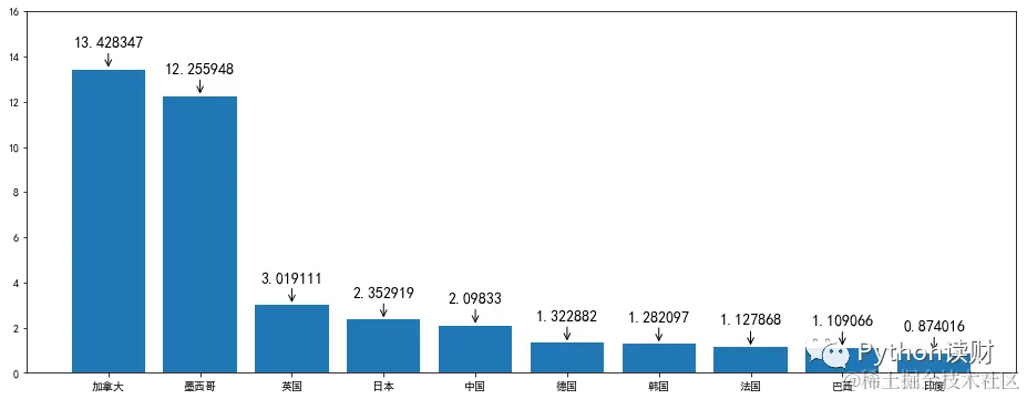 x_data = ['加拿大','墨西哥','英国','日本','中国','德国','韩国','法国','巴西','印度']