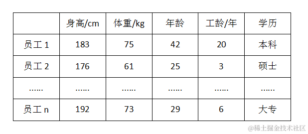 在进行相关性分析之前需要介绍几个概念,一是维度,二是协方差,三是相关系数。首先来看维度,以图1为例,这是一个员工信息统计表,这里有n个员工,分别是员工1、员工2、......、员工n,每个员工有5个属性,分别是身高、体重、年龄、工龄和学历。每个员工的信息都是一个观测,也叫一个样品,本文就统称观测,每个员工的一个属性叫一个指标,也叫变量、维度或者属性,本文统称维度。所以这个图中就有n个观测和5个维度。