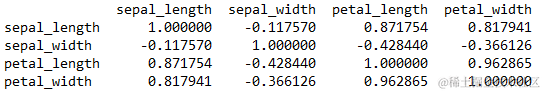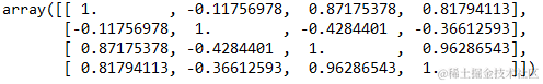 其中矩阵主对角线上的数值都为1(主对角线就是从左上角到右下角的那条斜线),这是因为主对角线的数值都是每个观测与自己的相关性,所以都是1,毕竟X=1X,Y=1Y,每个观测都等于1乘以自身。而图3中其他不为1的数字就是相关关系数值,一共有两个,这两个值相等,因为这两个值分别表示ρXY和ρYX,其值相等。同理我们可以求df中4个维度的相关关系,代码如下,这里rowvar代表以列为维度。