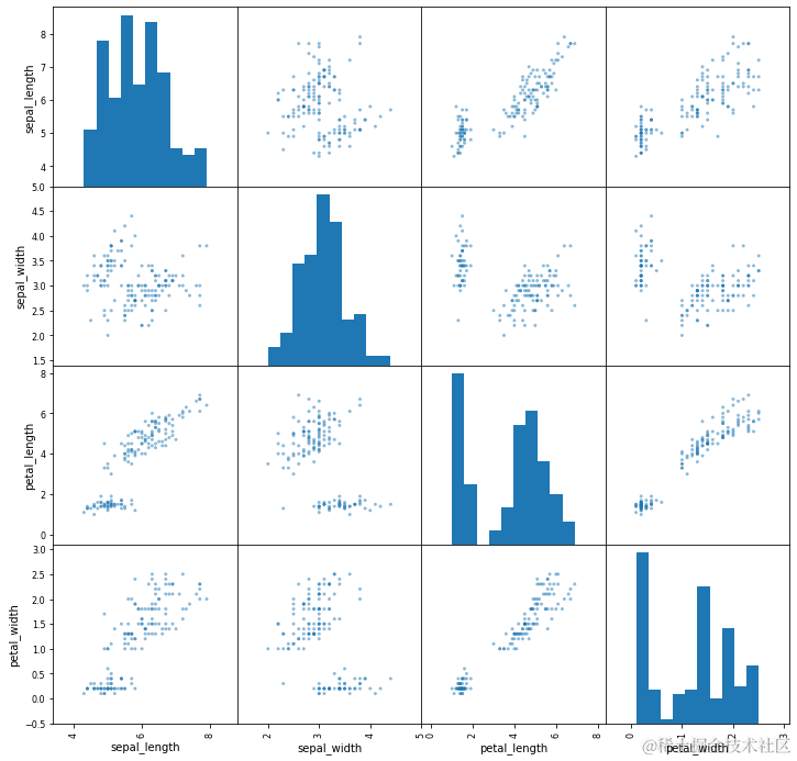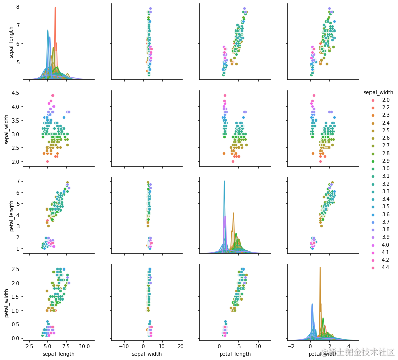 第一行代码结果如图6所示,是一张大图,其中包含16个子图,每个子图都是每个维度和其他某个维度的相关关系图,这其中主对角线上的图,则是每个维度的数据分布直方图。而第二行代码是画出同样的图形,但却以sepal_width这个维度的数据为标准,来对各个数据点进行着色,其结果如图7所示。从图中可以看出,sepal_width这列数据共23个不同的数值,每个数值一种颜色,所以生成的图是彩色的。
