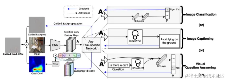 - Grad-CAM简单高效的类别响应可视化,图像的哪些像素决定了类型输出。关键在于类别输出对特征的梯度