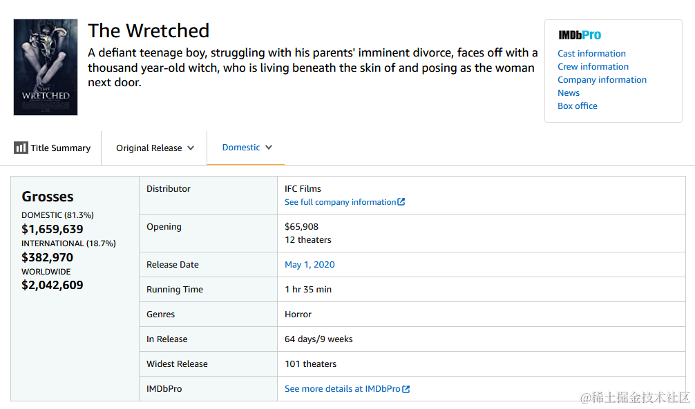 这个函数就是为了读取每部电影信息页面的信息,其功能和上面读取url页面的功能类似,都非常简单,没有过多可说的。在每部电影页面中,我们要读取的每部电影的分级信息就在Genres这一行,比如图2中电影The Wretched,其Genres信息就是Horror。