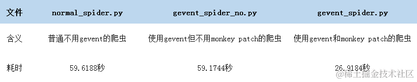 可以看出使用了gevent但不用monkey patch的爬虫和普通爬虫的运行时间几乎完全相等,而在用了monkey patch以后,运行时间只有前面程序的一半不到,速度提升了大约120%,仅仅一行代码就带来如此大的速度提升,可见monkey patch的作用还是很大的。而对于前两个爬虫的速度几乎完全一样,笔者认为原因在于这两个程序都是单线程运行,本质上没有太大区别,同时网页读取数量较小(只有18个网页),也很难看出gevent的效果。