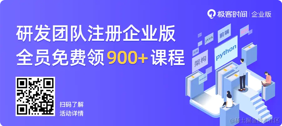 心动不如行动!如果你是一个团队leader,可以带领队员先试学一下极客时间的课程;如果你是一名工程师,可以把这个好消息告诉你的团队,一起领免费课程来学习。扫码领课????