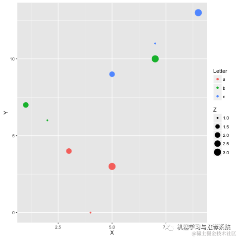 %%R -i df ggplot(data = df) + geom_point(aes(x = X, y= Y, color = Letter, size = Z))