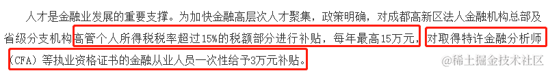 最近,成都高新区发布了《关于加快金融业高质量发展的若干政策》:**** 给予 CFA持证人一次性补贴3万元!