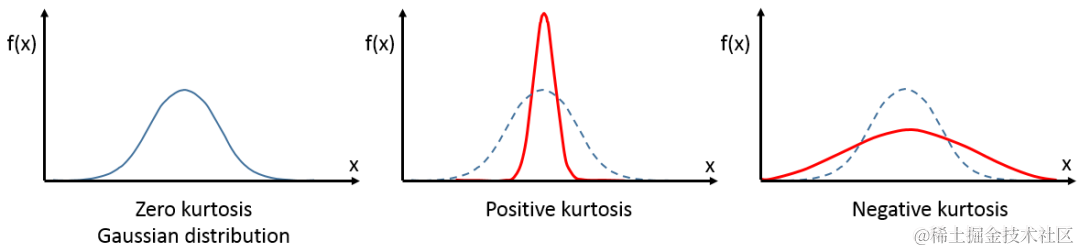 峰度的示意图如图3所示,其中第一个子图就是峰度为0的情况,第二个子图是峰度大于0的情况,第三个则是峰度小于0。
