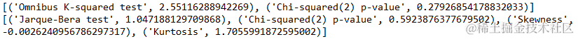 接下来我们再验证一下Skew、Kurtosis、Omnibus和Jarque-Bera (JB)这些数值,用的是statsmodels自带的方法。代码如下。