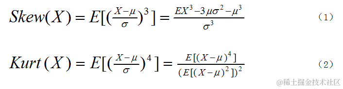 而峰度(Kurtosis)则是描述数据分布陡峭或平滑的统计量,通过对峰度的计算,我们能够判定数据分布相对于正态分布而言是更陡峭还是平缓。对于随机变量X,其峰度为样本的四阶标准中心矩,计算公式如图1中的式2所示。