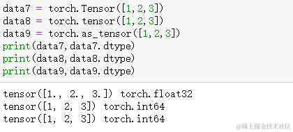 这里 Tensor 是类,tensor 和 as_tensor则是方法,第一种生成的是浮点型,后两种生成数据的类型和传入数据类型一致,也就是说传入整型生成整型,传入浮点型生成浮点型。\