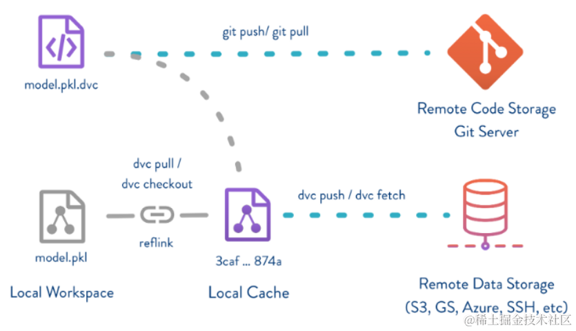 - git:负责代码和dvc生成的元数据文件的版本管理