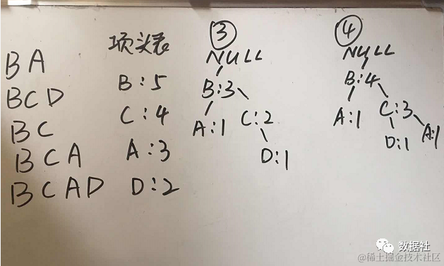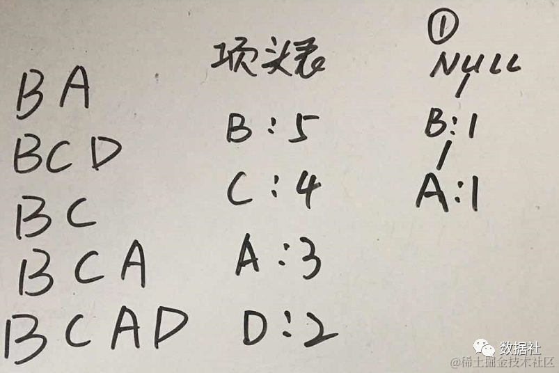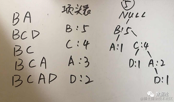 同理,按照上述方法,我们可以依次找到包含B的频繁项是(D): 2, (C, D): 2, (B, D): 2, (B, C, D): 2, (C): 4, (B, C): 4, (B): 5。