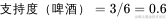 我们看啤酒出现了3次,那么5笔订单中啤酒的支持度是3/5=0.6。同理,尿布出现了5次,那么尿布的支持度是5/5=1。尿布和啤酒同时出现的支持度是3/6=0.6。
