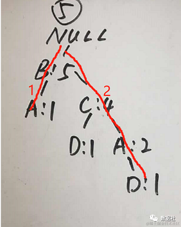 接下来插入第二行数据,由于第二行数据第一个数据也是B,和已有的树结构重合,那么我们保持原来树结构中的B位置不变,同时计数加1,C、D是新增数据,那么就会有新的树分叉,结果如下图:\