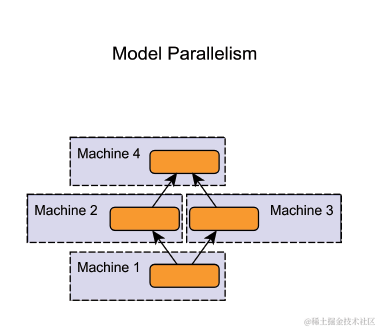 - 模型并行( model parallelism ):分布式系统中的不同机器(GPU/CPU等)负责网络模型的不同部分,通常是神经网络模型的不同网络层被分配到不同的机器,或者同一层内部的不同参数被分配到不同机器。一般是超大的模型,一张显卡放不下的情况,如NLP的模型。模型并行的缺点是层和层之间可能存在依赖关系,不能完全的并行。(图片来自网络)