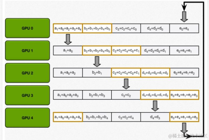 下面几张图,可以看到其中的几个步骤;ring-reduce为了加快速度,并不是一次性交换所有的参数;而是先把参数进行分割,不断交换分割后参数。