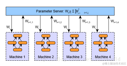 参数服务器模式,见下图。在每个worker执行完一个batch的训练后,反向传播参数的时候,所有的worker都会把参数传给参数服务器,进行汇总求均值,之后再传给每个worker,进入第二个batch的训练。(图片来自网络)
