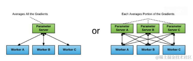 参数服务器有一个或者多个的结构模式,可以看出这种数据并行的模式效率是否提升取决于参数服务器与worker之间的通信效率,也就是最慢的worker的训练时间和参数服务器的接收和更新参数后再回传的时间。worker数量多的话,参数服务器可能存在瓶颈。(图片来自网络)