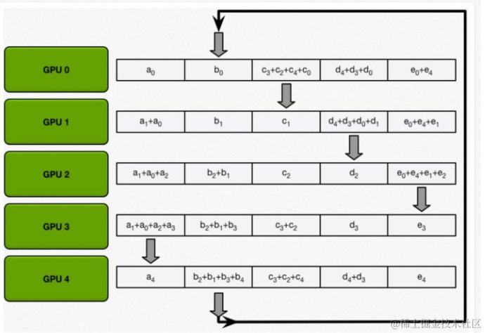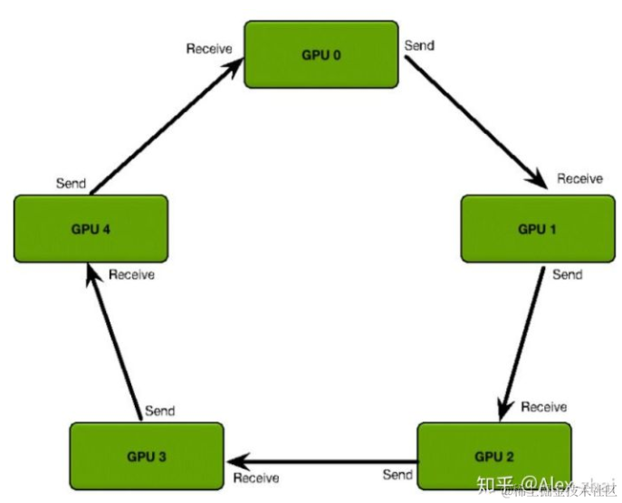 百度提出的ring-reduce摒弃了参数服务器,采用环状结构来更新参数。ring-reduce把所有的worker组成一个两两相邻的环形结构。每个worker只与相邻的worker交换参数。经过几次交换之后,所有的worker都包含其他worker的参数信息,达到更新的目的。(图片来自网络)