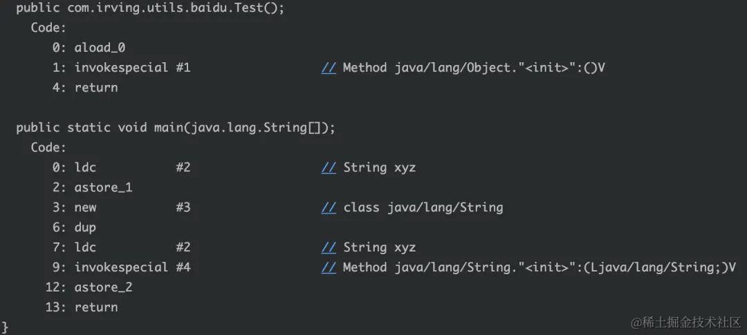 很明显,我们看到new 创建了一个String对象,同时ldc在常量池中创建了"xyz"字符串对象,之后invokespecial执行构造函数,astore_1赋值,return返回。