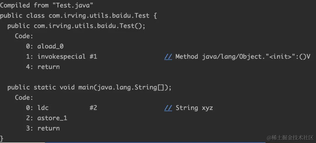 从结果来看,ldc命令在常量池中创建了一个"xyz"的对象,然后把他推至操作数栈顶,然后astore保存到局部变量,return返回。