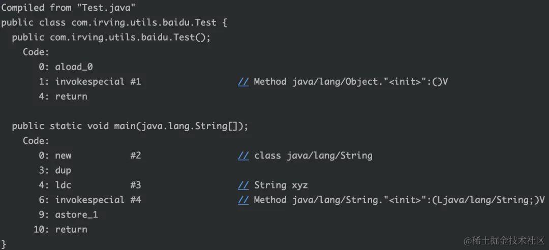 从这里,很明显的发现这就是我们例子1和2的一个结合,但是注意两次ldc后面的#2,#号代表着索引,说明第二次new String("xyz")的时候并没有重新创建xyz对象。