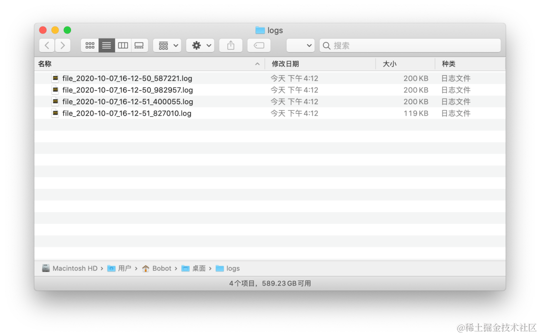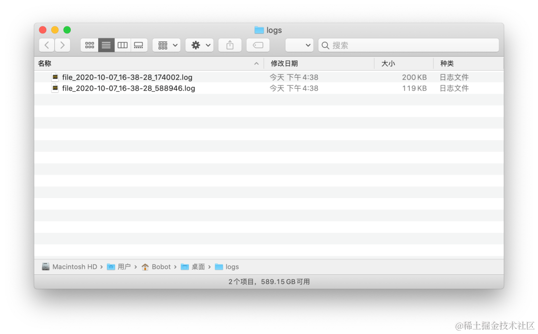 当然对 retention 传入整数时,该参数表示的是所有文件的索引,而非要保留的文件数,这里是个反直觉的小坑,用的时候注意一下就好了。所以最后我们会看到只有两个时间最近的日志文件会被保留下来,其他都被直接清理掉了。