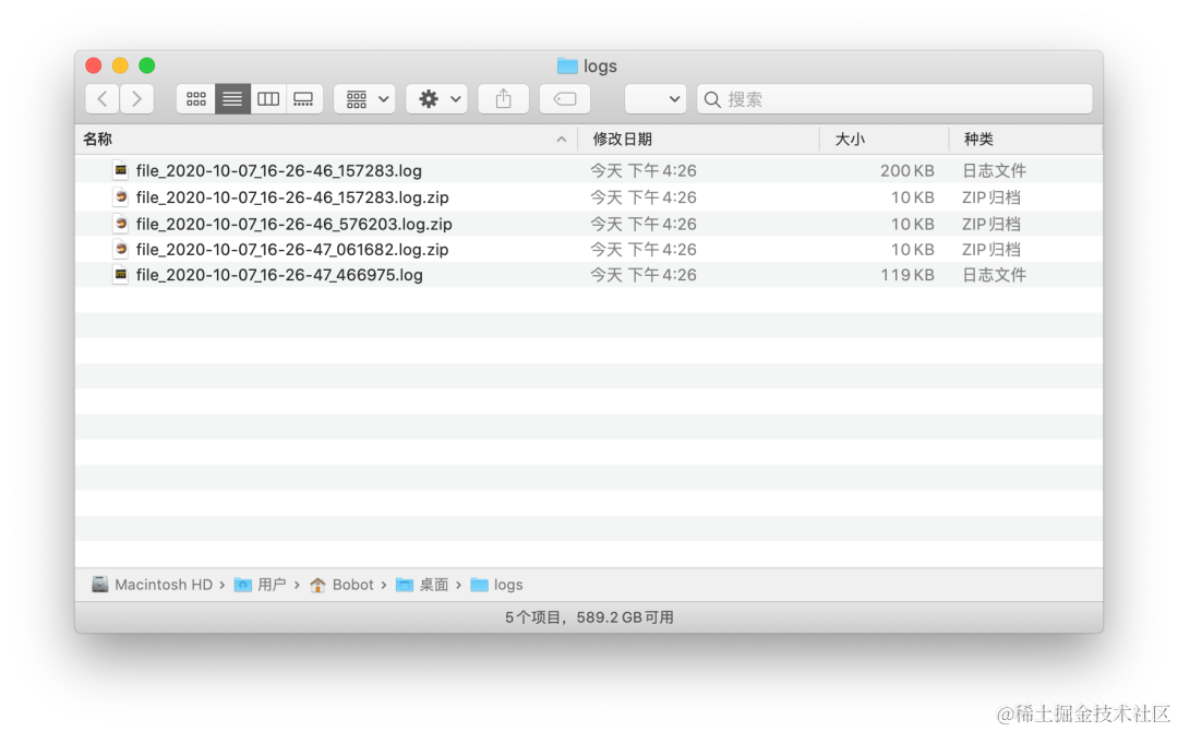 从结果可以看到,只要是满足了 rotation 分割后的日志文件都被直接压缩成了 zip 文件,文件大小由原本的 200kb 直接减少至 10kb,对于一些磁盘空间吃紧的 Linux 服务器来说是则是很有必要的。