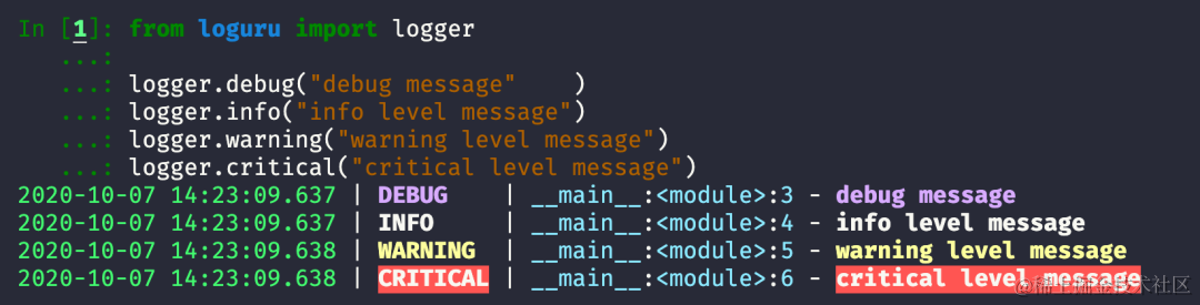 2020-10-07 14:23:09.637 | INFO | __main__:<module>:4 - info level message