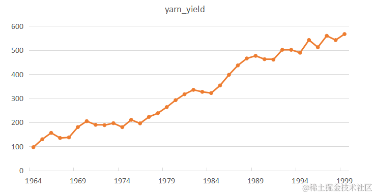 首先来说时序图检验,时序图就是普通的时间序列图,即以时间为横轴,观察值为纵轴进行检验。这里笔者给出3个例子,因为时序图过于简单,所以笔者在这里直接用Excel作时序图,用python也可以,不过没有Excel简单。第一个例子是1964-1999年中国纱年产量时间序列(该数据来自北京统计局),其数据如图2所示,序列图如图3所示。图3中明显可以看出,中国纱年产量序列有明显的递增趋势,所以它一定不是平稳序列。