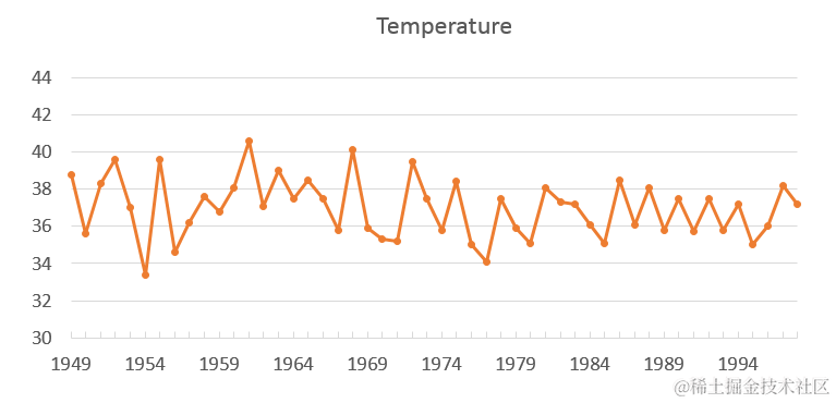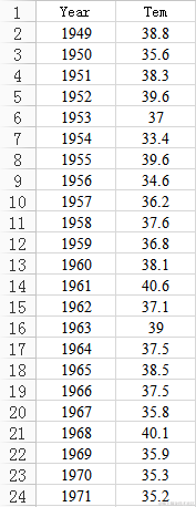 第三个例子是1949年至1998年北京市每年最高气温序列(数据来自北京市统计局),其数据如图6所示,序列图如图7所示。从图7中可以看出,北京市每年的最高气温始终围绕在37度附近随机波动,没有明显趋势或周期,基本可以视为平稳序列,但我们还需要利用自相关图进一步验证。