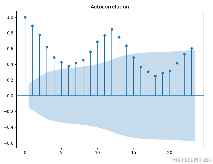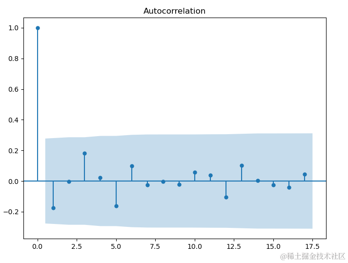 画自相关图用到的是statsmodels中的plot_acf方法,这个方法很简单,只需要直接输入数据即可,不过数据要是一维的,生成的3张图如图8、图9和图10所示。