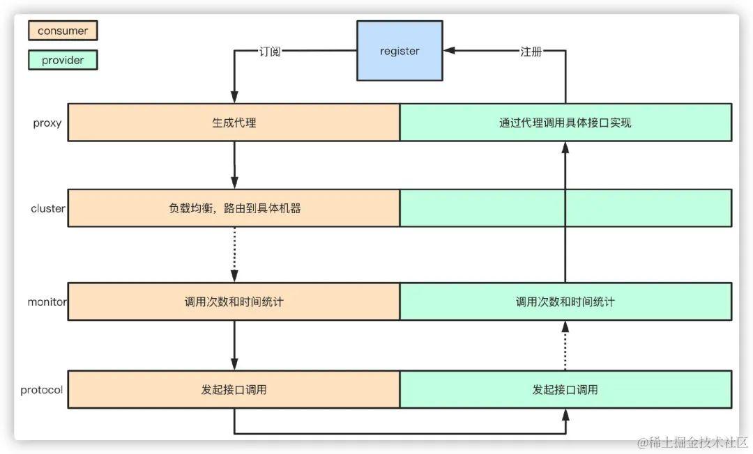 - 服务启动的时候,provider和consumer根据配置信息,连接到注册中心register,分别向注册中心注册和订阅服务