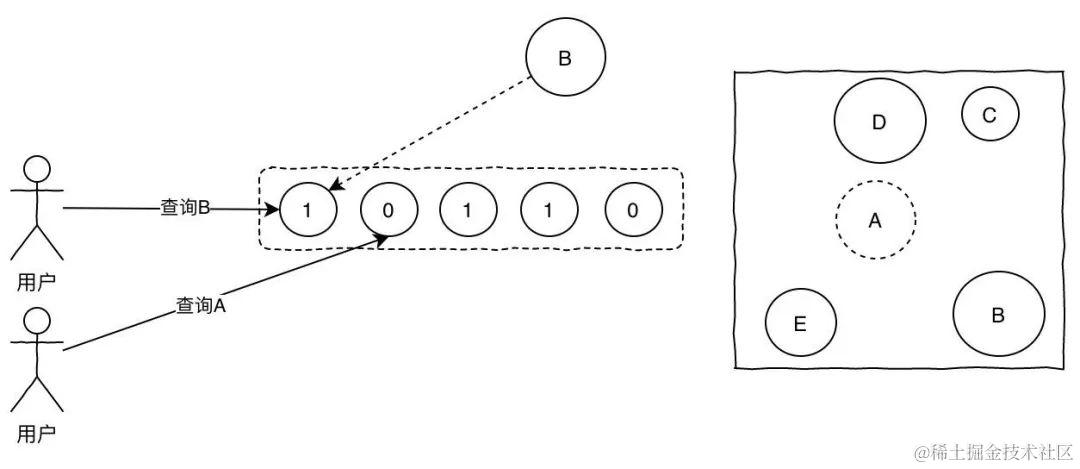 这样当用户再次来查询A,而A在布隆过滤器值为0,直接返回,就不会产生击穿请求打到DB了。
