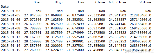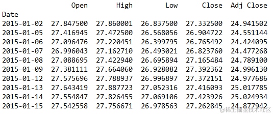 yfinance的时间参数有些不同,其是滞后一天的,所以我们要下载第一天2015年1月1日的数据,则要设置为'2015-01-02',截止时间也同样延后一天,同时设置progress=False,以关闭下载进度条。下载好的数据大致如图1所示。
