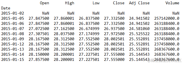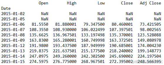 (2)min_periods:最小观测值,int类型,默认与window相等。其值一般小于等于window值,比如df.rolling(3,min_periods=2).max()[:10],就表示一个窗口期内至少有2个值存在,否则就不予计算,其结果如图3所示。假如有3个连续值都是NaN,则这个结果不参与计算。