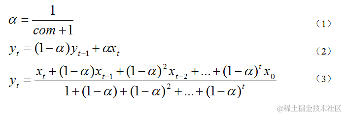 exponentially weighted moving window的递推公式如图6所示,其中com、span、halflife、alpha这4个值至少指定一个,alpha的公式如式(1)所示,当adjust为False时,递推公式用式(2);当adjust为True时,用式(3)。其代码如下所示,结果如图7所示。