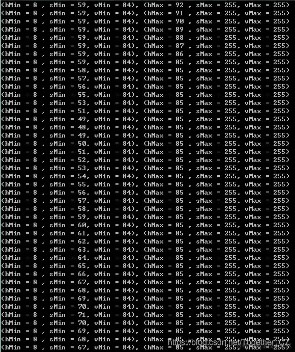 print("(hMin = %d , sMin = %d, vMin = %d), (hMax = %d , sMax = %d, vMax = %d)" % (hMin , sMin , vMin, hMax, sMax , vMax))