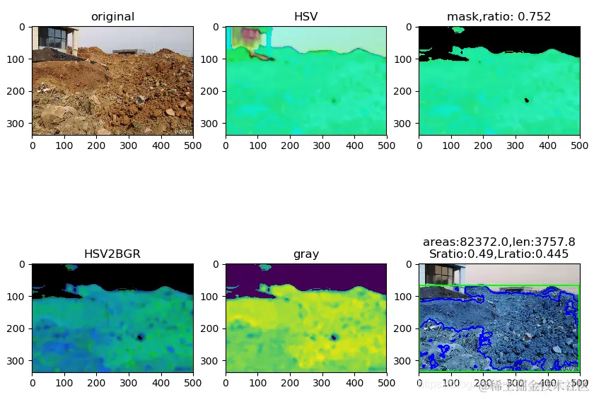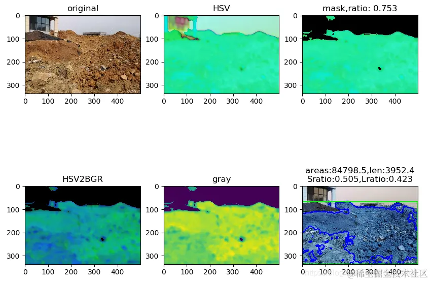 从上面的结果来看,比较完全地检测到了图中出现的土地的区域,最终,我们采用外切矩形的方式完成了对其轮廓数据的确定。