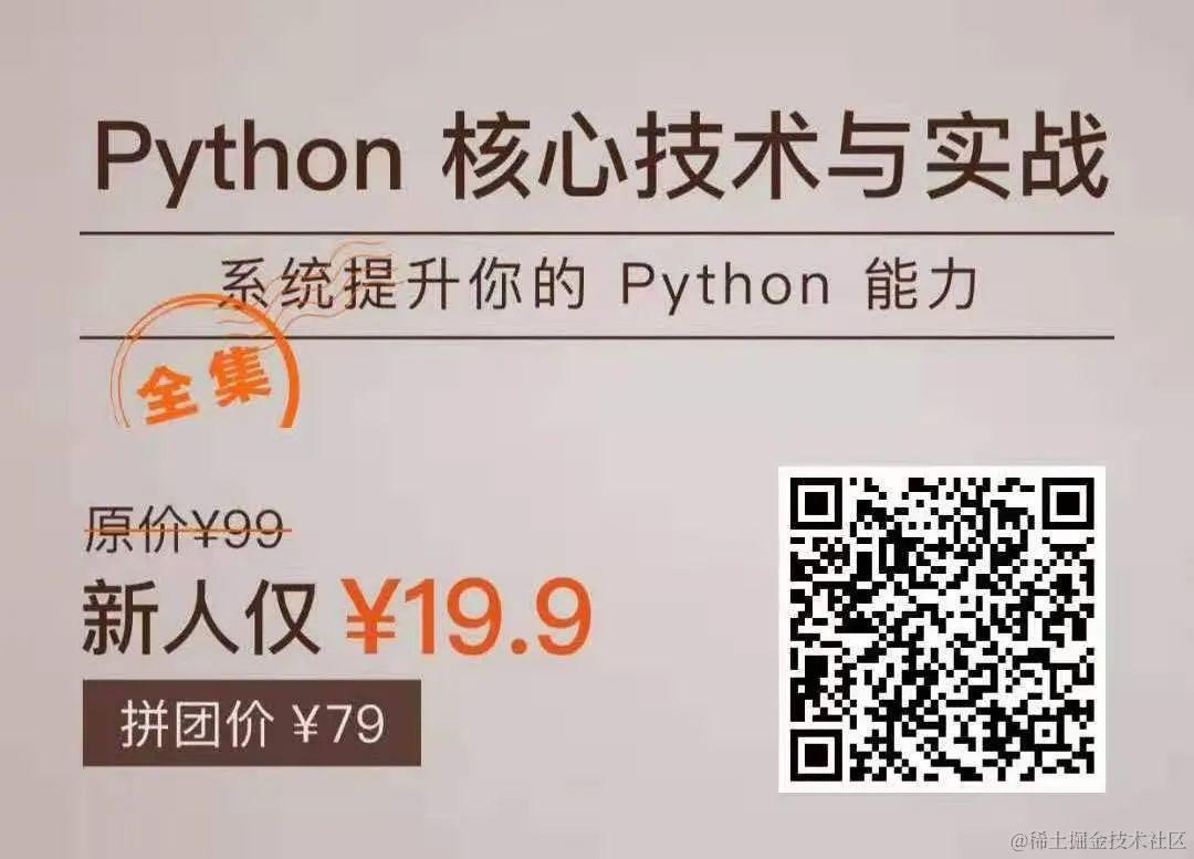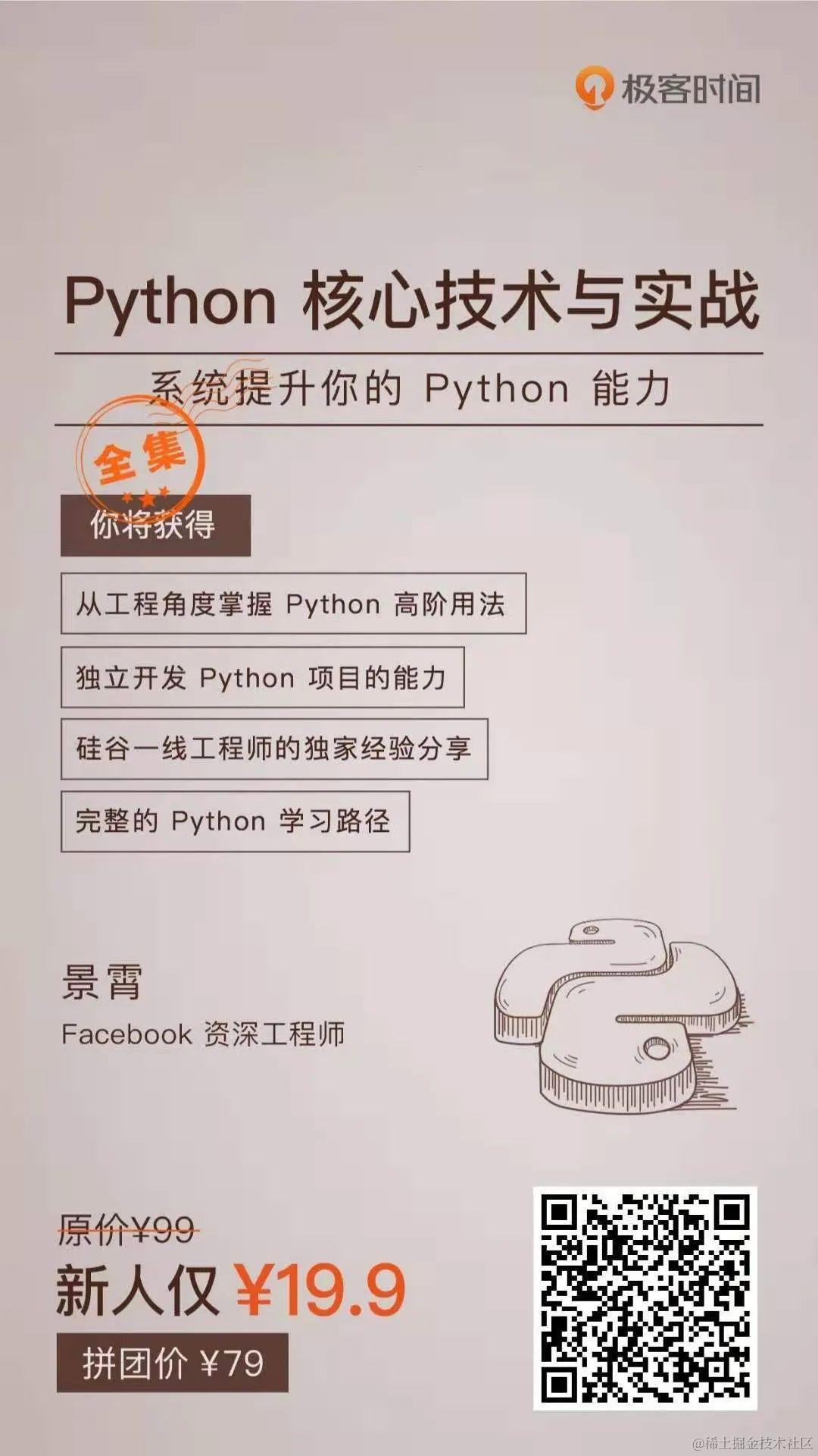 为了系统地帮大家提升 Python 实战编程能力,迅速从初学者进阶为优秀的 Python 工程师,我联合极客时间开设了一个专栏 《Python 核心技术与实战》。
