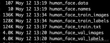 该文件表明,目标检测的类别数量(class)为1,训练数据的信息位于human_face_train.txt,验证数据的信息位于human_face_val.txt,类别名称(names)位于文件human_face.mames中,训练好的模型文件位于backup文件夹。