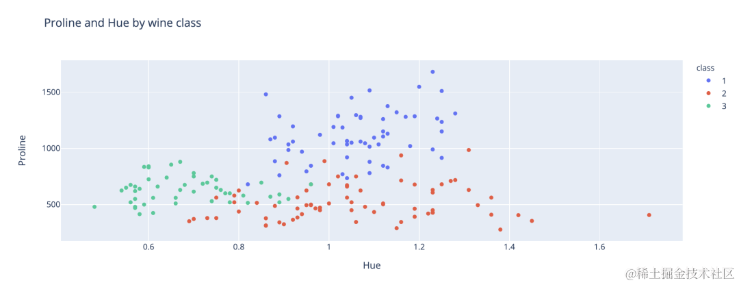 title='Proline and Hue by wine class',