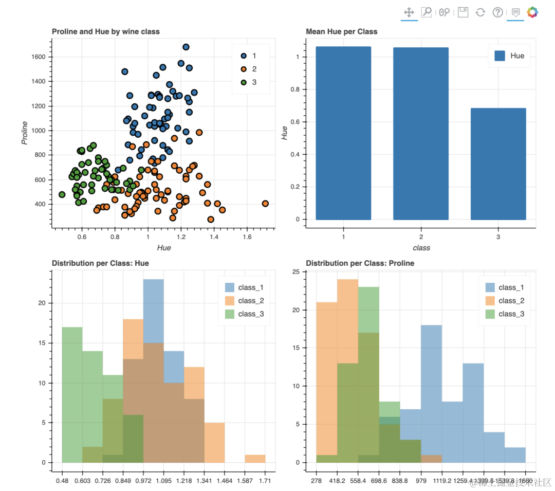 Bokeh还具有plot_grid函数,可以为多个图表创建类似于仪表板的布局,下面在网格布局中创建了四个图表。