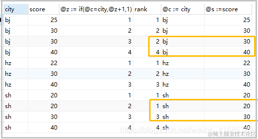 @rank := if(@c=city,if(@s=score,@rank,@z),1) rank,