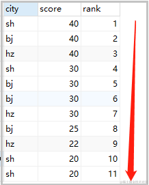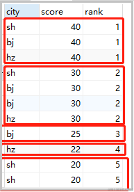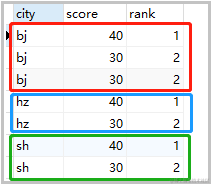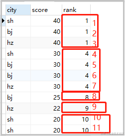 @rank := if(@c=city,if(@s=score,@rank,@rank+1),1) rank ,
