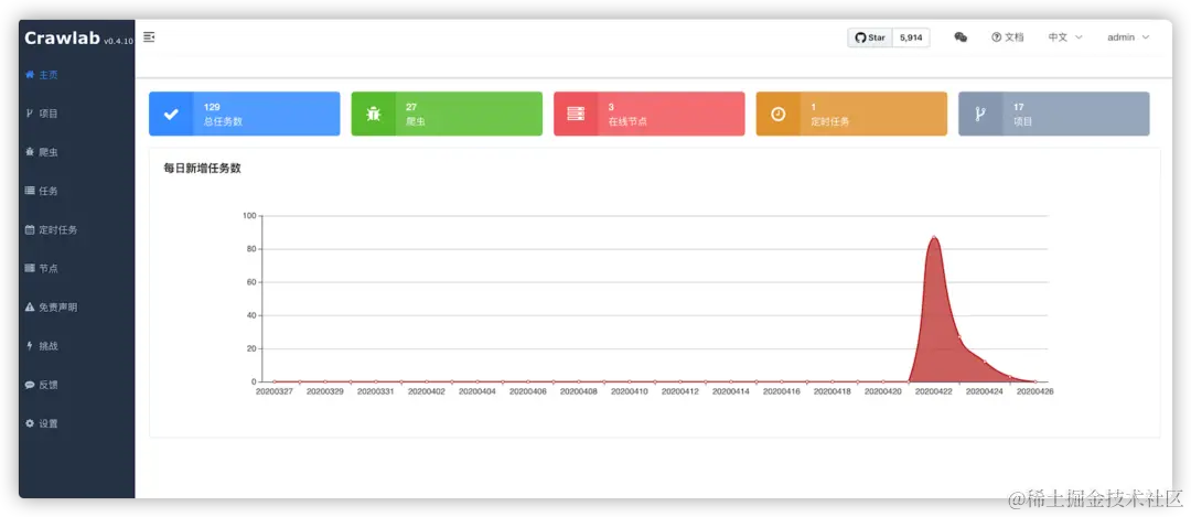Crawlab 是一款由知名外企工程师开发的分布式爬虫管理平台,它不仅支持 Python 语言编写的爬虫,几乎可以兼容大部分编程语言和应用程序。借助 Crawlab,我们可以将爬虫应用分散到不同的计算机(服务器)上,而且能够在可视化界面设定定时任务、查看平台上爬虫应用的状态以及环境依赖等信息。具体如下图所示: