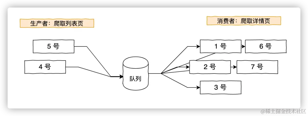 如果我们需要爬取的网站很多,那么就会用到分布式爬虫。如果分布式爬虫只是把 1 个爬虫程序复制出 N 份来运行,那么就会出现资源分配不均衡的情况,因为在上面提到的这种情况下,每 1 个爬虫都需要这么干活。实际上我们可以有更好的搭配方式,让它们的资源得到最大利用。例从列表页到详情页可以抽象为生产者和消费者模型: